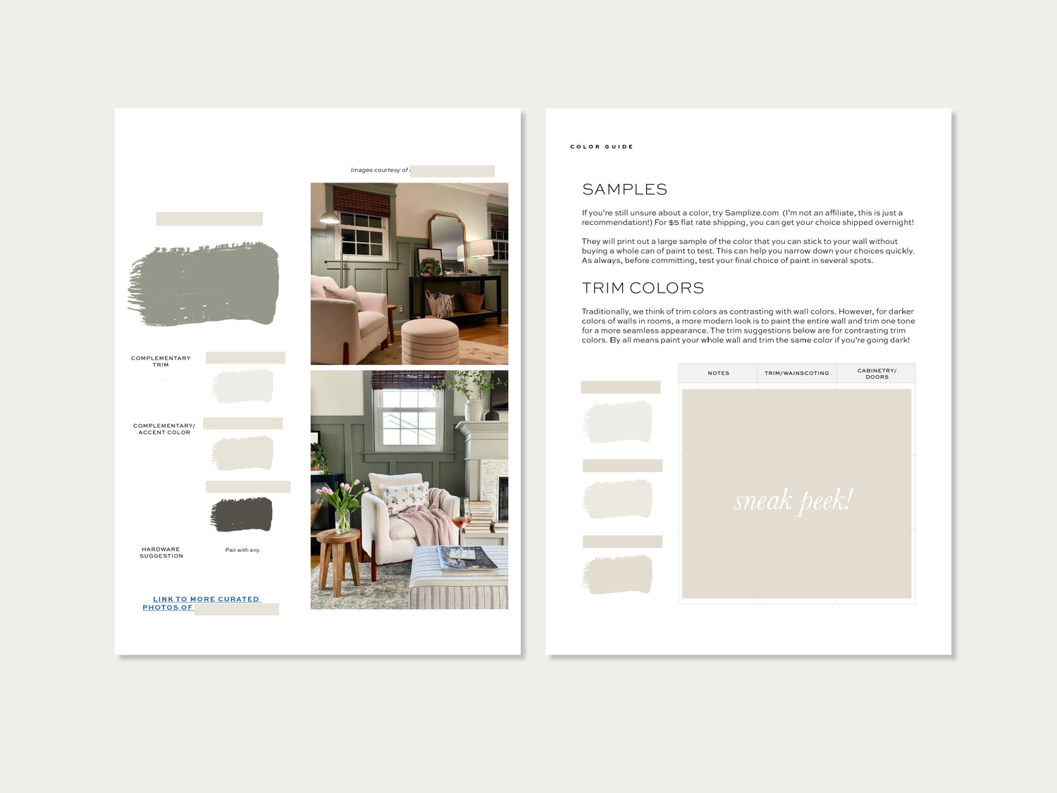Each palette includes 9 carefully selected colors with a complementary undertone (yellow/green/red/blue etc.) as well as trim and ceiling color options for the palette.